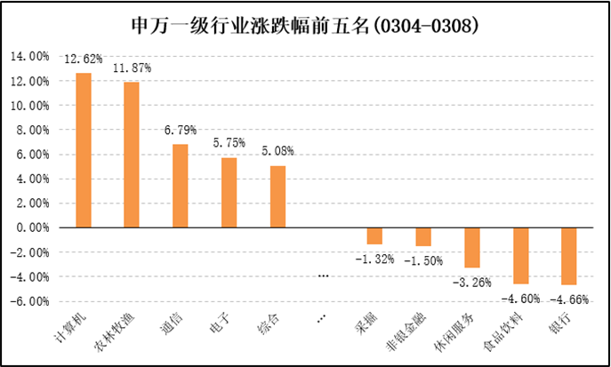 行业方面,28个申万一级行业中过半数上涨。其中,计算机、农林牧渔涨幅超过10%,通信、电子、综合涨幅居前;银行、食品饮料、休闲服务、非银金融、采掘涨幅较大,表现最差。二级行业方面,同样过半数上涨。其中,增值服务暴涨27.21%,领涨全市场;黑色家电、牧业、IT服务、计算机硬件、半导体、计算机软件涨幅均超10%,表现最佳;乘用车、白酒、保险跌幅均超5%,表现最差。