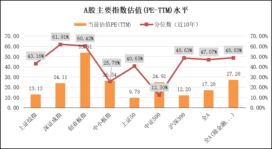 估值方面,当前A股整体估值处于历史较低水平。截至上周五,全部A股估值PE(TTM)由前周16.86倍上升至17.28倍,剔除金融、石油石化后全部A股估值PE(TTM)由前周26.68倍上升至27.28倍。中小板估值PE(TTM)由前周26.05倍上升至26.54倍,创业板估值PE(TTM)由前周52.63倍上升至53.91倍。沪深300估值PE(TTM)由前周11.90倍上升至12.20倍,中证500估值PE(TTM)由前周24.33倍上升至24.91倍。