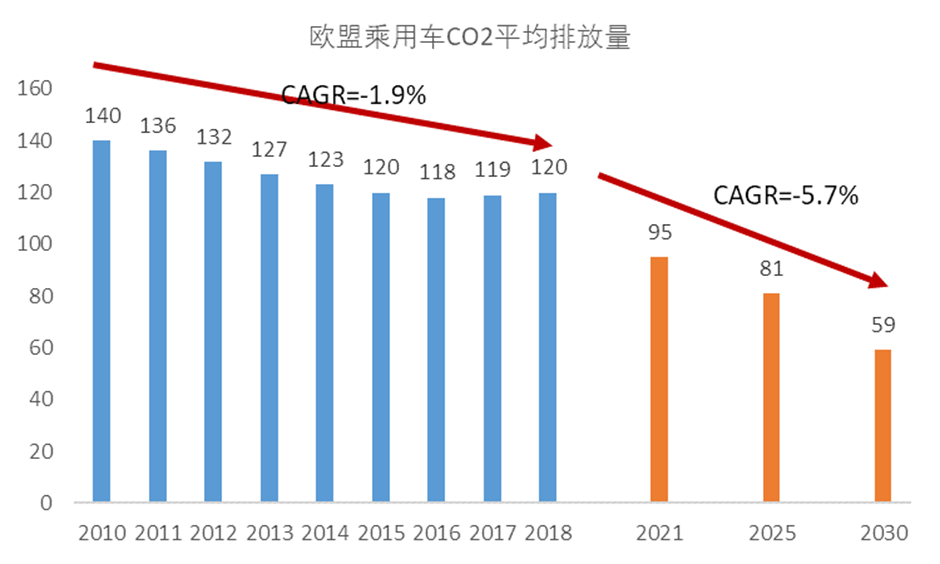 根据碳排放考核要求测算,2021年欧洲新能源车销量需达到接近150万辆,而2018年仅35万辆,意味着欧洲地区新能源车销量复合增速需达到50%-60%。