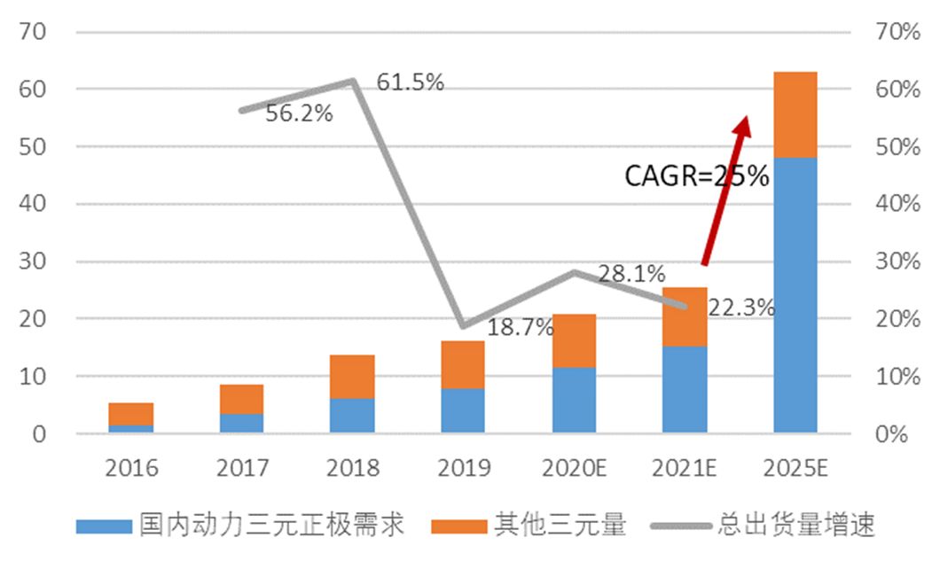 假设其他领域三元材料需求量年增速为10%,那么2020年国内需求总量25万吨,若单吨平均价格为15万元,国内三元正极材料市场空间大约为375亿;2025年若单吨价格下行至13万元,国内市场空间为940亿,假设全球市场为中国市场2倍,对应1900亿,空间足够大。