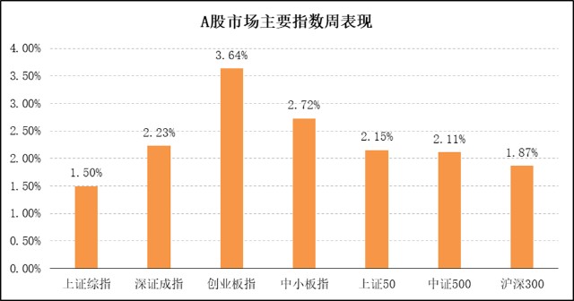 全周,各主要指数表现:上证综指涨1.50%,深证成指涨2.23%,创业板指涨3.64%;同期,上证50涨2.15%,沪深300涨1.87%,中证500涨2.11%。