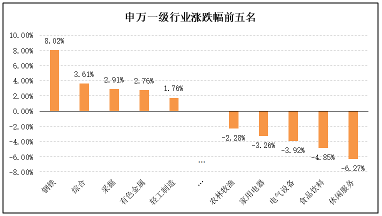 行业方面,28个申万一级行业中11个上涨,其中,钢铁、综合、采掘、有色金属、轻工制造行业涨幅前五。